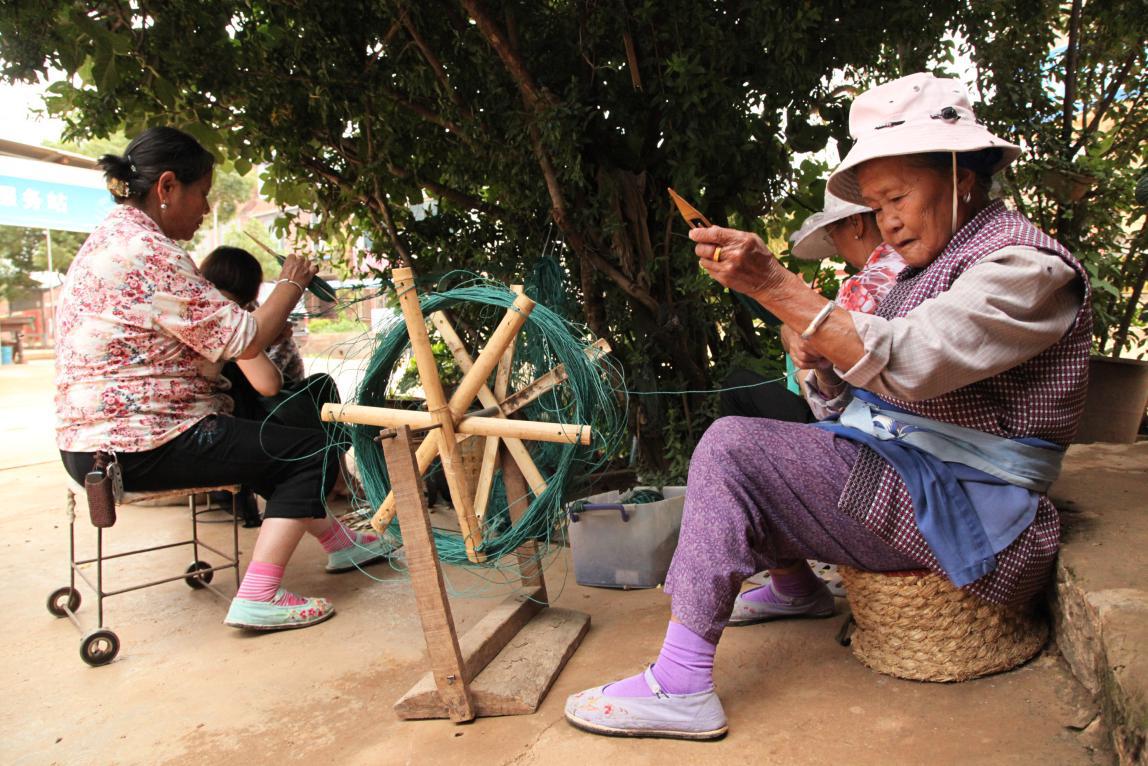 从老大娘的蓝色围腰仍可窥见滇池边传统服饰的风格,她手中编制的网也不再用于捕鱼,而是种花所用。