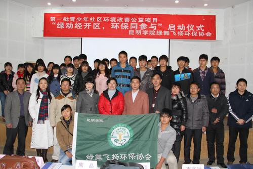 2013年1月11日上午,我校“第一批全国青少年社区环境改善公益项目”正式启动。启动仪式由学校“绿舞飞扬”环保协会副会长王光宇同学主持,学校熊晶副校长、省、市环境宣传教育中心、经开区环保局,校团委、经济学院相关负责人及“绿舞飞扬”环保协会指导单位学校昆明滇池(湖泊)污染防治合作研究中心领导和指导教师应邀出席,“绿舞飞扬”环保协会社团成员及青年志愿者参加启动仪式。