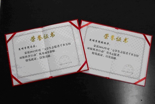 日前,在海口召开的 “2012年大学生志愿者千乡万村环保科普行动”经验交流暨表彰会上,由我校昆明滇池(湖泊)污染防治合作研究中心指导的“低碳生活进农村”科普活动,荣获“优秀指导教师”、“优秀志愿者”两项表彰。昆明滇池(湖泊)污染防治合作研究中心给予了本次活动全过程的指导、帮助与支持,中心冯庆副教授及我校志愿者经济学院张振华同学分获“优秀指导教师”及“优秀志愿者”称号。