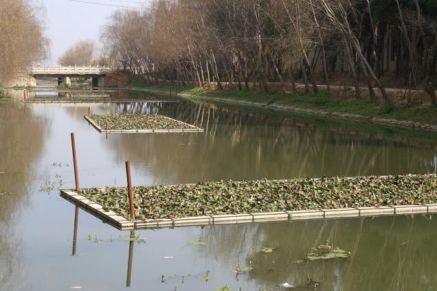在距入湖口两公里处及入湖口处我们分别采集了水样并进行了快速测定。从得到的数据可以看出,该河段溶解氧含量有所提高、氮磷含量有所降低。随后,我们又到了紧邻大清河的海河,其河面上也种植了一些生态浮床,其整治河道的方式与大清河相似。